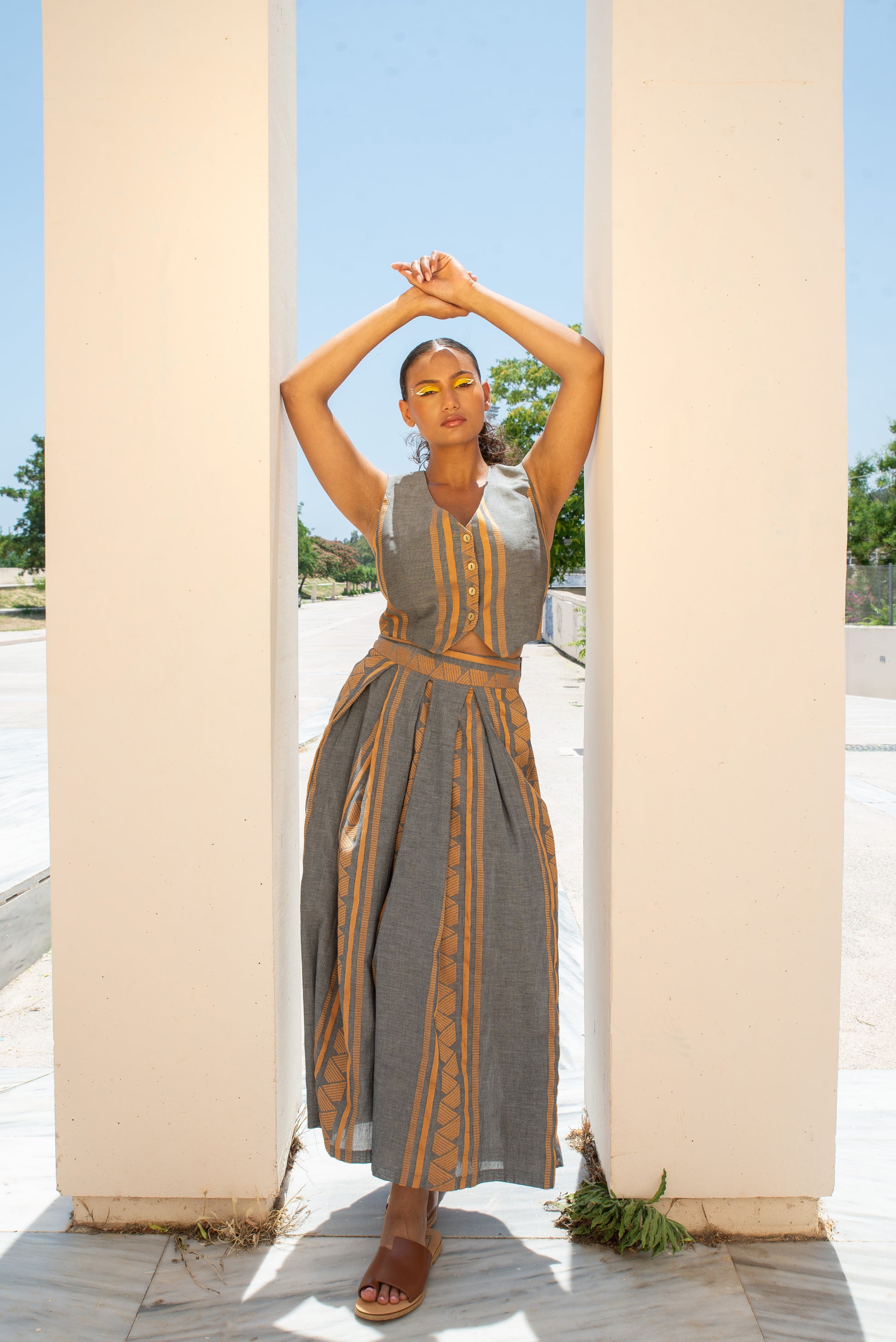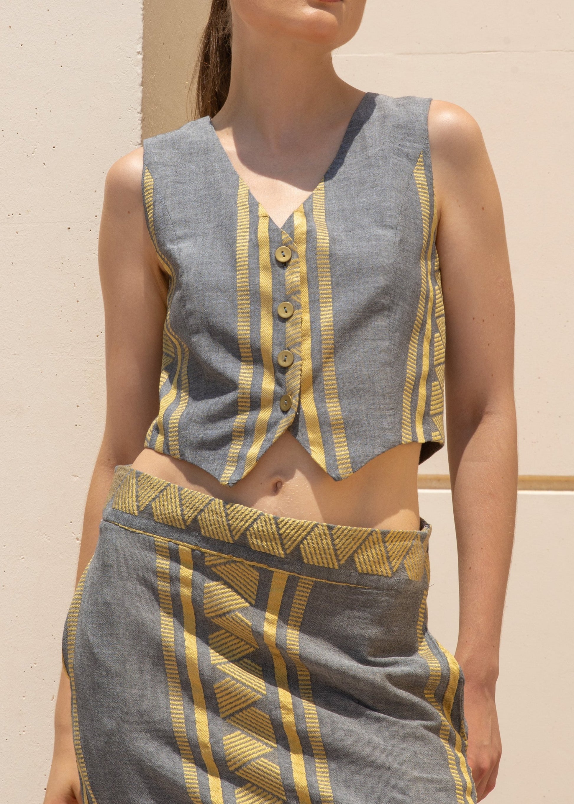 Die ELPIS Weste von DIOMAS ist ein vielseitiges Fashion-Piece aus besticktem Baumwollstoff. Sie ist die perfekte Ergänzung zum FLOGA Rock und lässt sich sowohl im Sommer als Top als auch im Winter über einem Hemd tragen. Die filigrane Stickerei verleiht der Weste einen eleganten Touch, während der leichte Stoff für Komfort sorgt. Ein idealer Allrounder, der zu jeder Jahreszeit und für verschiedene Outfits getragen werden kann.
